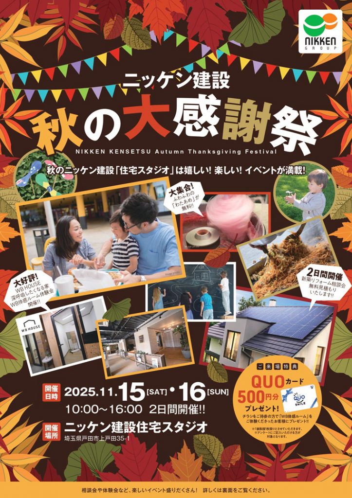 11月15日(土)・16日(日) ニッケン建設住宅スタジオにて秋の大感謝祭を開催いたします。