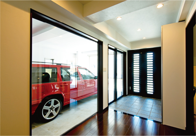 雨風を気にせず建物内に入ることができるビルトインガレージ。広々した玄関ホールには大きな窓があり愛車を眺 めることができます。